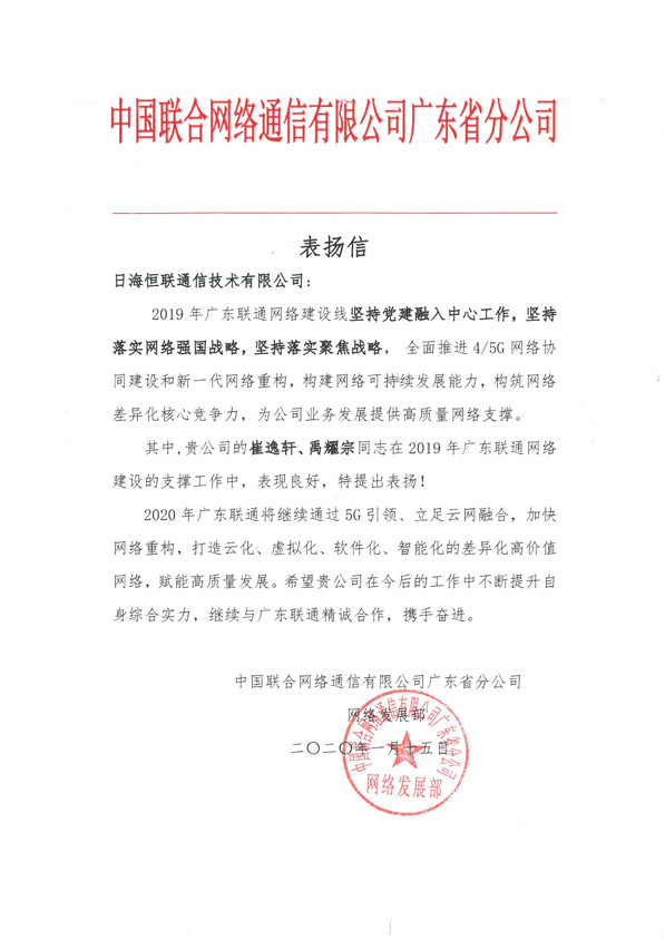 轉(zhuǎn)發(fā)“中國聯(lián)合網(wǎng)絡(luò)通信有限公司廣東省分公司網(wǎng)絡(luò)發(fā)展部”對(duì)我公司員工的一封表揚(yáng)信
